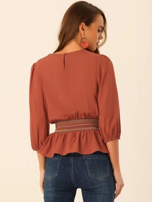 This relaxed peplum top features half sleeves and the contrast color trim as leisure essentials in summer. An endlessly wearable style, the peplum with a smocked waist is a good fashion of casual elegance. Wear it with your black pants and high heels for a full casual look. Classic and timeless charm every season with this smocked waist blouse.