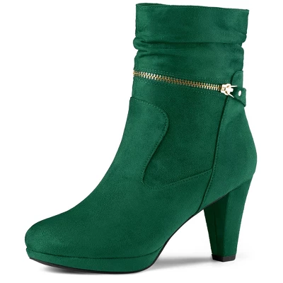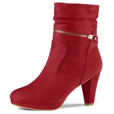 This high ankle boots featuring a chunky heel, round toe style finished with zipper closure for a bit of eye – catching movement every time you take a step.Round Toe Side Zip Booties; Shaft Style;Ankle High Stylish Women Boots;Vamp: Faux Suede; Outsole: Rubber; Heel: ABS;Heel Height: 3 3/8 inches;Platform Height: 3/5 inches;Shaft Height: 6 1/9 inches.