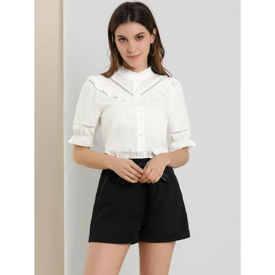 This simple blouse is easy to coordinate with your existing wardrobe. Regular silhouette offers a breezy, comfortable fit for all-day wear. Beautiful lace detailing adorns the yoke of this short-sleeve top for an undeniably charming look. A ruffle neck lace top makes for a classy feel and show you charming side. Pair it with a jeans or light color pants to match the feminine vibe.