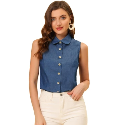 A Peter Pan collar provides preppy finishing touches for this lovely sleeveless shirt. Summer casual style is great with shorts or skirts and sandals, cool and versatile. This closet-staple chambray top with a Peter pan collar boasts an adorably chic yet relaxed vibe. Updating your collection, this shirt is plain for easy mixing and matching.