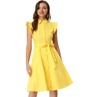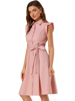 - Ruffled Sleeve, Point Collar, Knee Length, Button Down Closure, Pintuck Detail, Belted Dress