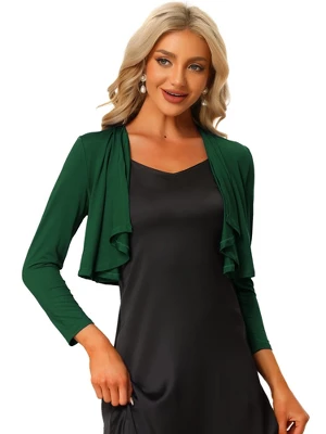 This soft shrug is cut with a versatile open front and 3/4 sleeve length. This elegant 3/4 sleeve top is made of lightweight fabric and can match any camisole or spaghetti-strap dress in the wardrobe. A bolero shrug is suited to a dressy dinner party or cocktail dinner. Crafted from lightweight chiffon, this flowy bolero is perfect for layering over tailored frocks and camisoles. The decent three-quarter sleeves add subtle, textured elegance to this flowy, gauzy wrap shaped with a draped front.