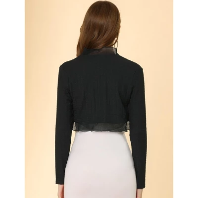 Give your look a glamorous upgrade with the Allegra K Long Sleeve Shrug Top! Designed in stretchy knitted fabric, it features a ruffle collar and cropped silhouette. Framed with ruffles, this cropped cardigan from Allegra K is romantic, feminine, and stylish. Paired with an elegant dress for an effortless and romantic look. Give your look a glamorous upgrade with the Allegra K Elegant Long Sleeve Ruffle Shrug.