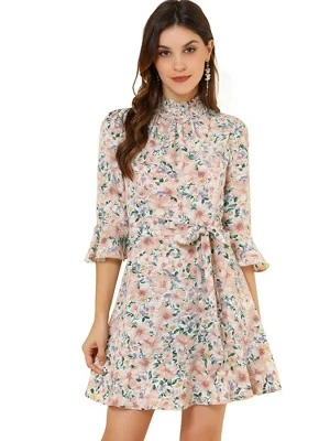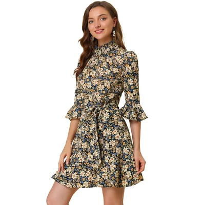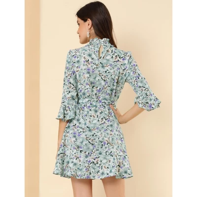This flowy dress can be worn for weekend occasions or during the working week. This floral dress features a ruffled trim, adding extra fluttering to your every step. 3/4 Bell sleeves frame this elegant mini dress punctuated with a flouncy ruffled hem. Bell sleeves accentuate the flowy silhouette of a short dress patterned with floral. This belted dress features a floral print, ruffle trumpet sleeves, and a ruched neckline. Paired with anything from sandals through to office flats.