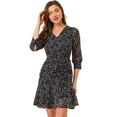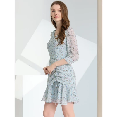 Twist the night away in this floral ruched dress to a romantic, eye-catching style. Ruffles and drawstring ruched design bring sweet style to this 3/4 sleeve dress in chiffon with an eye-catching print. Sweet and vintage, this floral chiffon dress is styled with side ruching, elastic back, and button decor front.