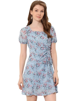 - Floral Print, Square Neck, Short Sleeve, Side Zipper