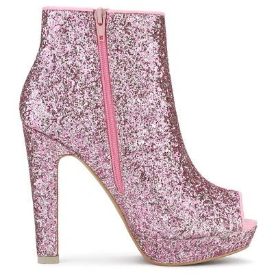 - Open Toe Glitter Boots, Platform Chunky Heel Ankle Boots, Zip Closure, Gold, Pink, Silver, White Color