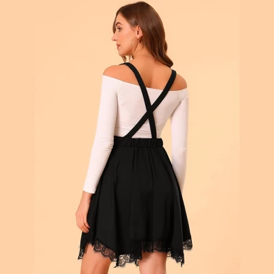 - This gothic suspenders skirt features a lace hem with an asymmetrical design