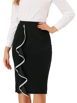 Designed with a split hem, the skirt from Allegra K is smart yet flattering. Falling just below the knee, the skirt is easily teamed with a tucked-in blouse and court shoes for a polished look. Upgrade your workwear collection with this skirt from Allegra K. Crafted from a soft fabric, the timeless fitcreates a form-flattering profile with feminine charm. This flattering skirt falls just below the knee for understated style and wears well with anything from fine knits to fitted blouses. Make a statement in the office with this elegantly fitted skirt from Allegra K. This piece hugs the body and finishes just below the knee to create a feminine silhouette. It features frill detailing at the side, adding to its elegant charm. Pair it with statement heels and a draping blouse to complete this polished look.