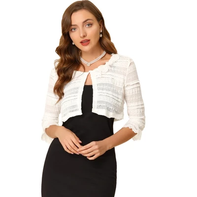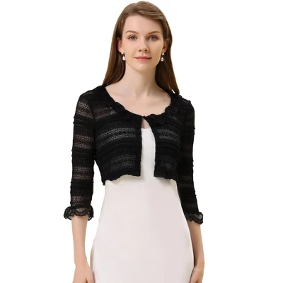Made of soft and stretchy fabric, this lace cardigan features sheer sleeves, 3/4 Sleeves, and ruffle cuffs. Perfectly pair it with sleeveless dresses for a charming look. Featuring sheer lace, 3/4 sleeves, ruffle cuffs, and soft stretchy fabric, this cardigan shows elegant and feminine look from day to night. Take this cardigan to enhance your wardrobe. It is a good choice to wear it for many occasions and cool weather. Perfectly pair it with a sleeveless dress, spaghetti strap or tank tops.
