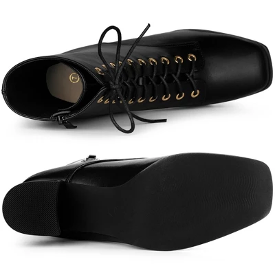 These chic square-toe booties are designed with a front lace-up, and side zipper and feature a block heel for a contemporary update. And they can allow the toes to move comfortably. Lace Up Ankle Boots; Square Toe; Chunky Heels; Block Heel; Side Zipper; Vamp: Faux Leather; Outsole: Rubber; Heel: ABS; Heel Height: 2 3/8 inches; Shaft Height: 6 1/2 inches.
