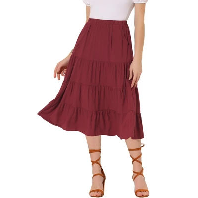 Slant pockets for effortless wear and an A-line tiered flare hem help to create an elegant and flowy look in spring or summer. In a midi length, this skirt with a fit-and-flare silhouette and an elastic waist exudes a carefree summer feel. This midi skirt features a ruffle hem and side pockets for a crisp finish to any look. Pair it with any sandals to create a variety of looks.
