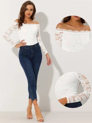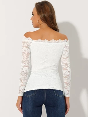 This floral lace blouse is fashioned with the off-shoulder design and feminine sheer long sleeves. Made of lightweight semi-sheer fabric in a fitting silhouette, this elegant lace blouse from Allegra K is designed with lace trim and full sleeves, which is an effortless option for weddings, night out, or party. Elevate your style in this off shoulder top made from floral lacefabric. Scalloped lace trim is adding a romantic feeling to this stretchy blouse, especially for ladies.