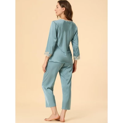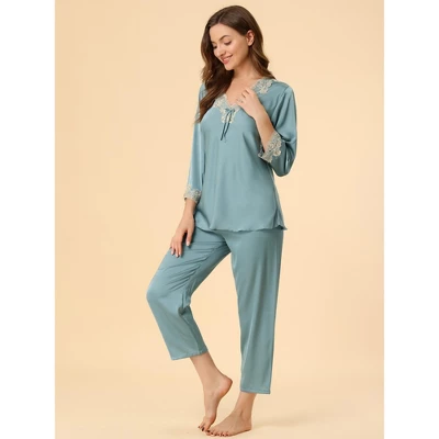 - Two-Piece Sleepwear Set, 3/4 Sleeves, V Neck, Elastic Waist Pants, Lace Insert