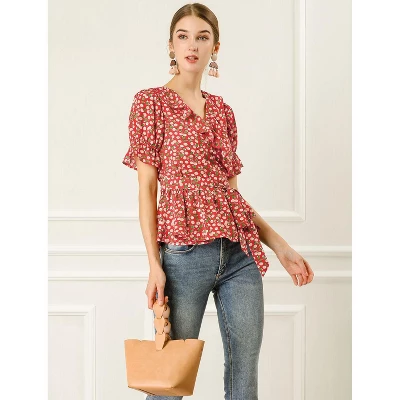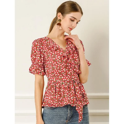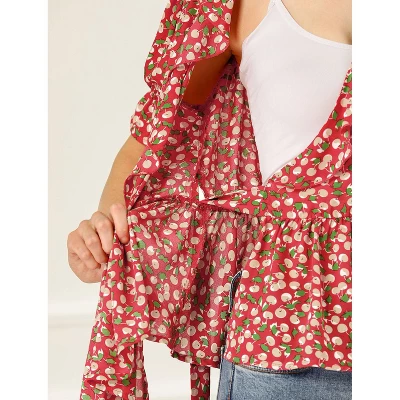 - Fruit /Floral Pattern, Crossover V Neck, Ruffle, Puff Sleeves, Ties at Waist, Peplum, Wrap Blouse Top