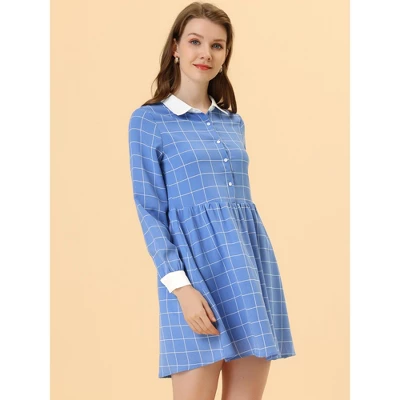 - Plaid/Grid/Gingham, Long Sleeve, Contrast Collar, Half Placket, Mini Length, Partially Lined, Loose Fit