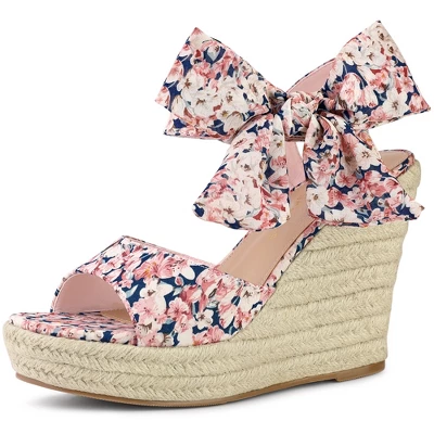 - Platform, Floral Printed, Wedges Sandals, Open Toe, Slingback, Bow Decor, Espadrille Heel