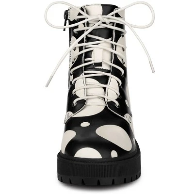 These Polka Dots print strappy platform heels combat boots with a round toe and zip closure, add a chic and elegant taste and catch the eyes of people. Classic patterns, round-toe design, never out of date. Zip Closure, easy to wear. Faux leather vamp, more textured. Easy to go with all outfits, wear them with jeans, trousers, dresses, shorts, or denim. Good options for parties, sweet dating, shopping, festivals, banquets, office outfits, casual wear, and daily outfits.