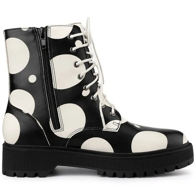 - Red Platform Combat Boots, Lace-up Boots for women, Polka Dots Printing, Chunky Heels, Round Toe, Zip Closure