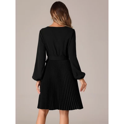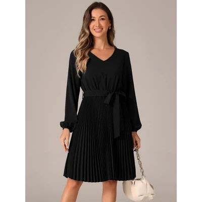 The tie waist accentuates your silhouette and adds a touch of femininity to the look, while the pleated A-line skirt creates movement and grace with every step. The V-neckline frames your décolletage beautifully, while the long sleeves offer coverage and sophistication, making it suitable for various occasions. This dress has a classic design and modern details, radiating confidence and poise in an outfit that is sure to turn heads wherever you go.