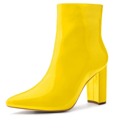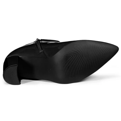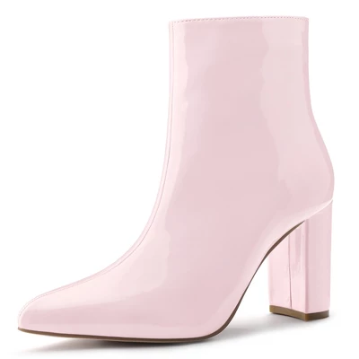 This lacquer technology of patent leather shows one kind of luxury. With the mirror surface, and just the right height, these ankle boots are well paired with dresses, jeans, or skirts. Besides, the pointed-toe style can make your legs more slender. These boots are easily on and off with the zipper style. Patent Leather Ankle Boots; Side Zip Boots; Block Heel; Ankle High; Comfortable Insole; Vamp: PU; Outsole: Rubber; Heel: ABS; Heel Height: 3 5/9(9cm); Shaft Height: 5 1/8(13cm).