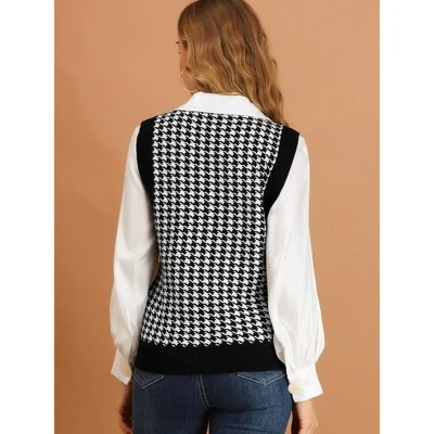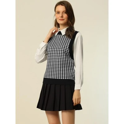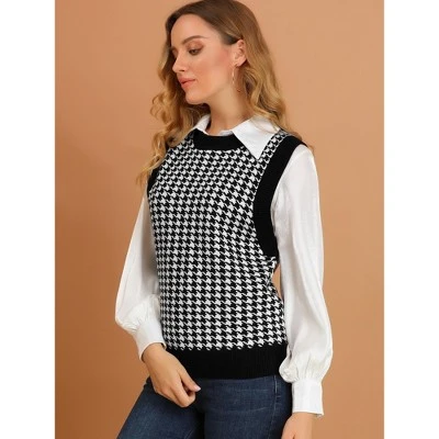 This sleeveless and contrast color sweater is very comfortable and cute. It will make you look fashionable. You can match it with your base shirt and wear it outside, since the mix and match style is very trendy. This fashionable knit sweater vest is designed with classic houndstooth pattern knit. It is an elegant, and soft women’s sweater vest.