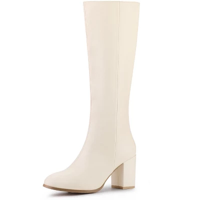 These fashionable chunky heel knee-high boots with zip closure, a surefire way to top off any outfit, from jeans to shorts, dresses, and skirts of any length, make you more eye-catching. Classic chunky heels and knee-high boots. Faux leather vamp, makes your boots look more textured. Round toe design. Rubber Outsole and ABS heel, anti-slip effectively. Moderate heel height, makes you feel more comfortable.
