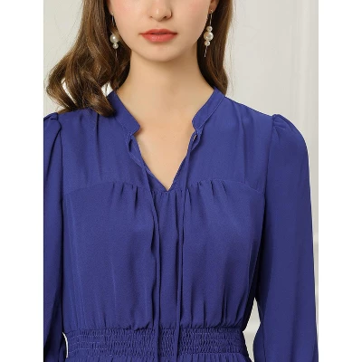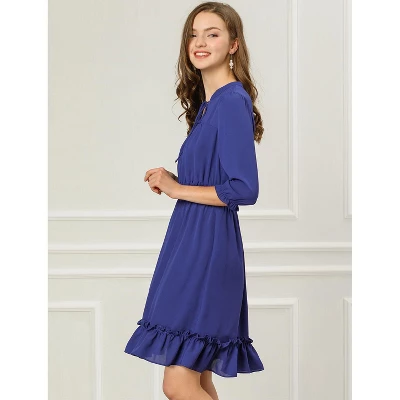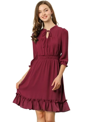 Opt for a sophisticated look with the chiffon dress. It is delicately adorned with fluid ruffles through the skirt and sleeves and a demure stand collar with a tie-neck for a feminine look. It flatters the figure with a smocked waist to create an a-line fit. Team it with smart flats for a modern daytime look. A simple style that will never fail to impress.