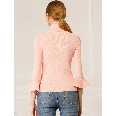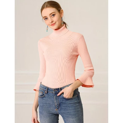 - Pullover Turtleneck, 3/4 Ruffled Sleeves, Slim Fit, Stretchable, Rib-Knit