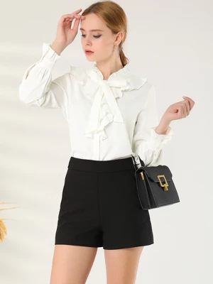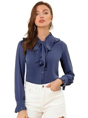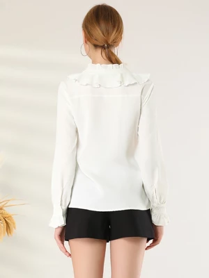 Bursting with charm, this sweet ruffled-neck shirt is trimmed with a frilly flouncy ruffled trim. Simple and delicate, this shirt features a bow-tie neck, a ruffle neck, a ruffle front, buttons front, ruffle cuffs, long sleeves, and solid color. This nice and neat solid shirt gives office chic a whole new meaning. This essential top is perfect for dressing up or down. The charming ruffle details at the neck, front, and cuffs add femininity to this shirt.