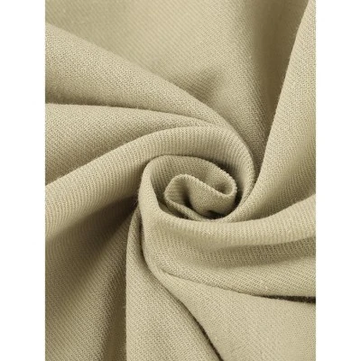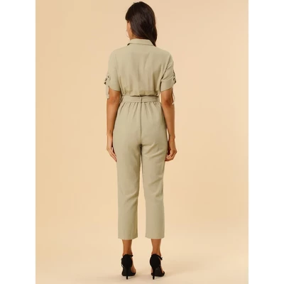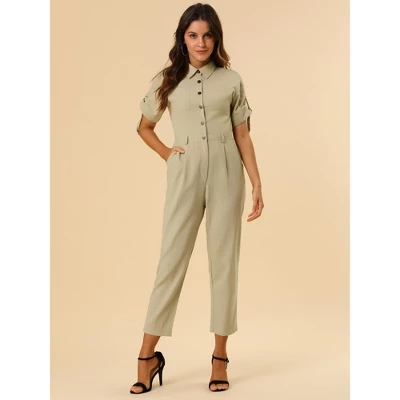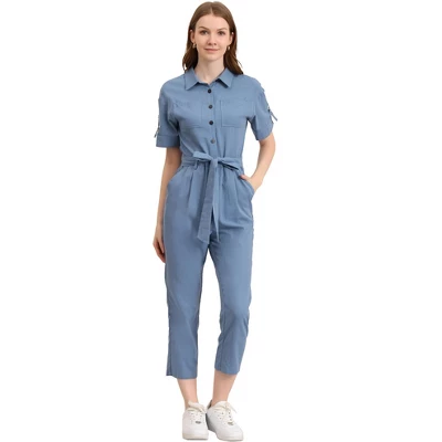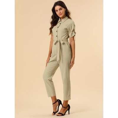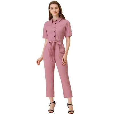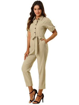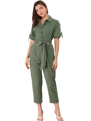 A solid belted jumpsuit is ready for you to move in and out of the office. This ankle-length jumpsuit is in a cotton weave with a grandad collar, buttons down the front to the waist, and open chest pockets. Gently dropped shoulders, short sleeves with a tab and D-rings, and a seam at the waist with elasticated at the sides and detachable tie belt. With the design of the self-tie belt, it can accentuate your graceful figure. Made of cotton fabric, this comfy jumpsuit is a good choice for daily wear, weekend gathering, and office day. Perfect to pair it with strappy heels and delicate earrings. The model is wearing in size XS. (Height: 5’9″, Chest: 31 4/5 inches, Waist: 23 1/5 inches, Hip: 36 3/5 inches, Shoulder Length: 16 1/5 inches, Weight: 124.6 lbs)