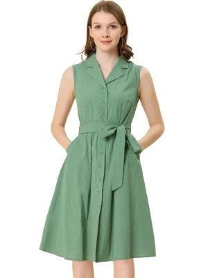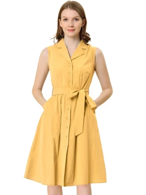 This sleeveless shirt dress features a button-down front, slant pockets, and a waist tie for a classic look, polished off by a slightly curved hem for a little extra character. From long days in the office to chic happy hours, this sleeveless shirt dress will easily complement your effortlessly chic style. Pair with strappy heels or flats for a versatile, go-to look. Occasion: Business, Work, Career, Office, Weekend, Daily, etc.