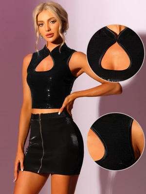 - Sleeveless, Stand Neck, Sequins, Cut Out, Crop Tank Top