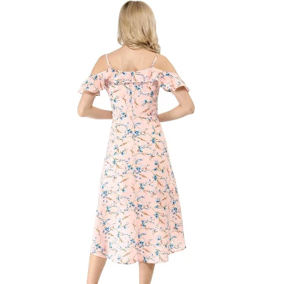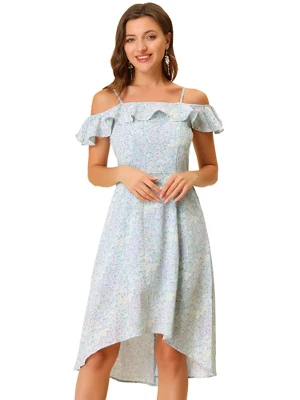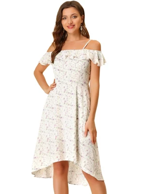 The frilly ruffles float at the sleeves and the high/low hem of this enchanting floral frock add to vintage feminine appeal. A fluttery high/low hem frames your lovely stems in this romantic floral dress with a swing style design and pleated, capped shoulders. Fluttering this way and that, an airy chiffon midi offers a romantic look with a classical square neck, the graceful asymmetry and a flowy high/low hem. the fluttery ruffles drape off the shoulder and a rippled high/low hem of this lightweight midi dress styled helps enhance movement and comfort.