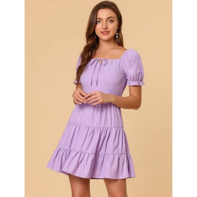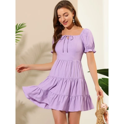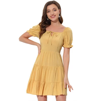 - Tiered Dress, Cinched Smock Elastic Back, Tie Neck, Ruffle Sleeves with Elastic Cuffs, Square Neck, Above Knee