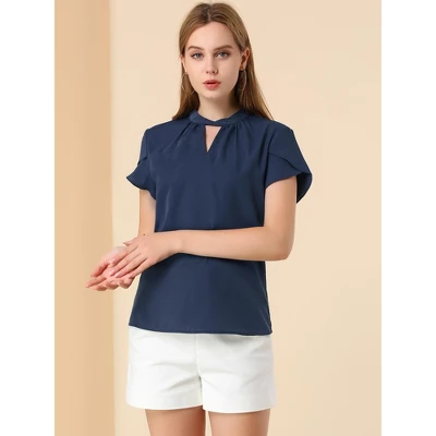 It has a relaxed silhouette with a neat choker neck and a pretty keyhole back. Delicate tulip sleeves frame this pretty solid color top that is perfect for work or daily wear. Made of a lightweight fabric, this solid blouse offers gentle airy wear, with a choker neck creating an elegant style. A unique collar details a graceful blouse with lovely short sleeves. A classic summer top will get you a long way in the workdays. This elegant chiffon blouse with a keyhole at the back is a smart-casual winner, taking you from work to the weekend without fuss.
