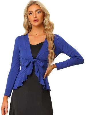 - Front Opening, Long Sleeve, Ribbed, Tie Front, Ruffled Hem, Cropped Length, Slim Fit