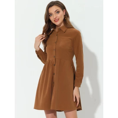 - Button Front Closure, Slip Pockets, Corduroy Fabric, Fit Flare Dress, Button Cuff, Casual Shirt Dress