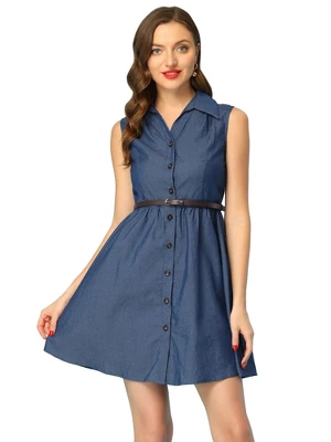 Update your wardrobe collection with this classic chambray navy-blue dress for summer daily. The classic design and a belted waist can highlight your waistline and elongate your leg. The flowy dress hem adds more charming for you. The shirt dress for women with denim color is great for summer time, and you can pair it with sport shoes or sandals to build a vintage and casual look.
