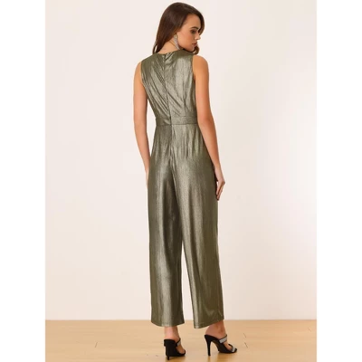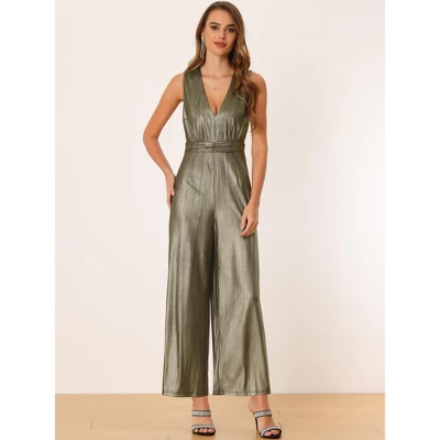 This metallic jumpsuits detail with the glitter fabric, the v neck and no sleeve, which add your feminine and elegant. A jumpsuit with a v neck and the wide leg design offers a charming look for day or night. They are suitable for casual, weekend, party, cocktail, club, vacation, date, night out, etc. Pair them with pretty bags and high heels for a fashion look.