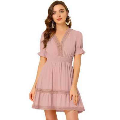 Cut to an elegant fit-and-flare style, this summer dress is sure to serve you well on summer days. The dreamy solid color and a ruffled tiered hem bring casual romance to this puff-sleeved dress. Indulge in the fanciful frills on this vacation-ready dress. It is fashioned with a signature v neck, a crochet trim, and a layered skirt. Above-knee and flowy, this gorgeous dress is detailed with bubble sleeves, and a lace panel, for a peasant look, which is sure to elevate your beach-day looks.