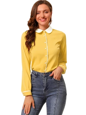 Create an endless look in this piping button-up shirt. Perfectly match your trousers and heels for a charming look. The contrast piping brings a modern style to this button-up shirt. Showcase your business style in this button-up shirt. It features contrast piping decor and a Peter pan collar. The contrast collared shirt is a perfect gift for your girlfriend, wife, mother, sisters, or friends.
