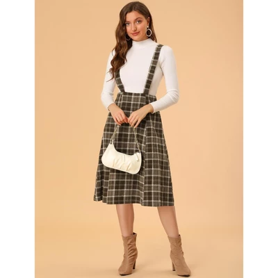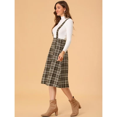 The suspender skirt with a plaid printed and A-Line design is a great highlight, full of a sense of detail and design. A classic plaid motif adds timeless sophistication to a midi suspender skirt with an easy pull-on design. This tartan suspender skirt is easily paired with tops and flat shoes for a vintage and fashionable look.