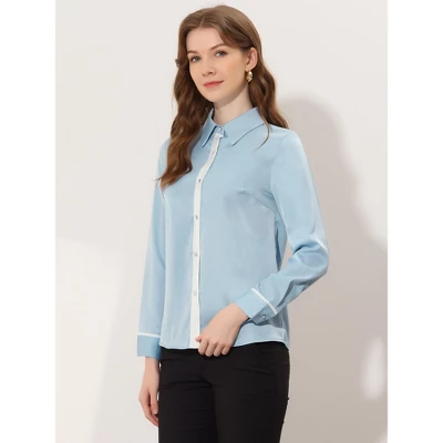 Your wardrobe is not complete without this work office shirt. Designed in soft satin fabric brings a relaxed and comfortable feeling. Contrast trim brings charm to this blouse that suits any occasion. Pair it with highhigh-waistts or a skirt to get an elegant and fresh look. This contrast shirt is great to create an elegant look, made from a smooth satin fabric for all-day comfort.