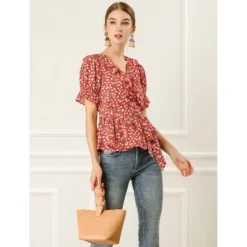Allegra K Women’s Peplum Waist Sweet Cherry Floral Crossover V Neck Ruffle Wrap Blouse