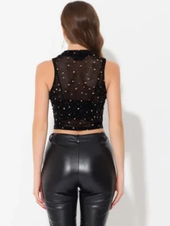 Allegra K Women’s Metallic Star Mesh Mock Neck Sleeveless See Through Party Crop Top