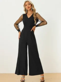 Allegra K Women’s Elegant V Neck Mesh Long Sleeve Loose Wide Leg Party Jumpsuits